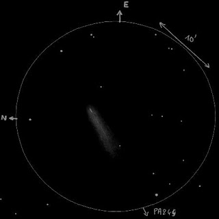 J'ai pu observer au printemps 2006 l'un des retour d'une comète aux caractéristiques assez proches : 73P/Schwassmann-Wachmann . Sa trajectoire de 5.3 ans de période est passée à seulement 0.08 UA de la Terre en Mai 2006 où elle brillait avec une magnitude 7 environ. La grande différence est que 73P étant en fait le reste d'une comète désagrégé dont les morceaux les plus importants avaient un diamètre de 1km environ (comme 45P). La comète était faible et avait un déplacement très rapide dans le ciel, ce qui ne facilitait pas la photographie. J'ai pu par contre faire un bon nombre de dessins des fragments B et C de la comète ( les plus gros). Cela donne une petite idée de ce qu'on peut voir dans un télescope de 200mm avec un grossissement de 80x :